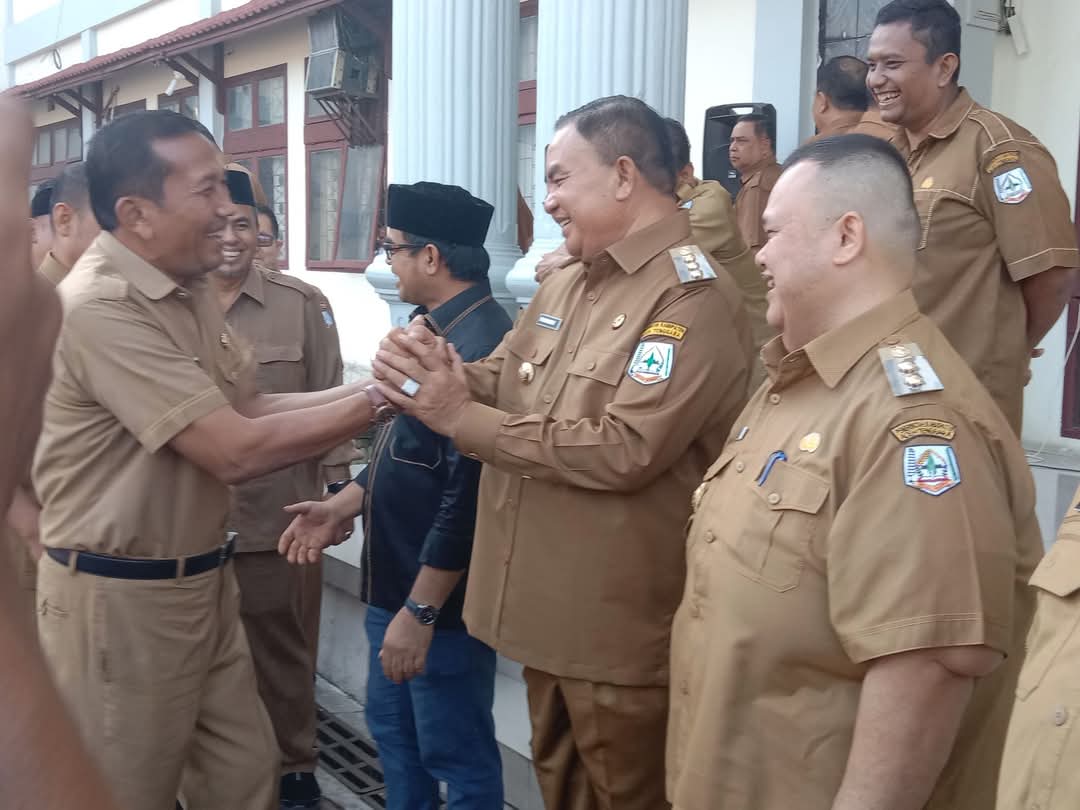 Mantan Pj Bupati Agara Taufiq ST.M.Si bersalaman dengan ASN di lingkungan Pemkab, di halaman Kantor Bupati, Senin (17/2)2025, beberapa saat sebelum bertolak menuju Banda Aceh.