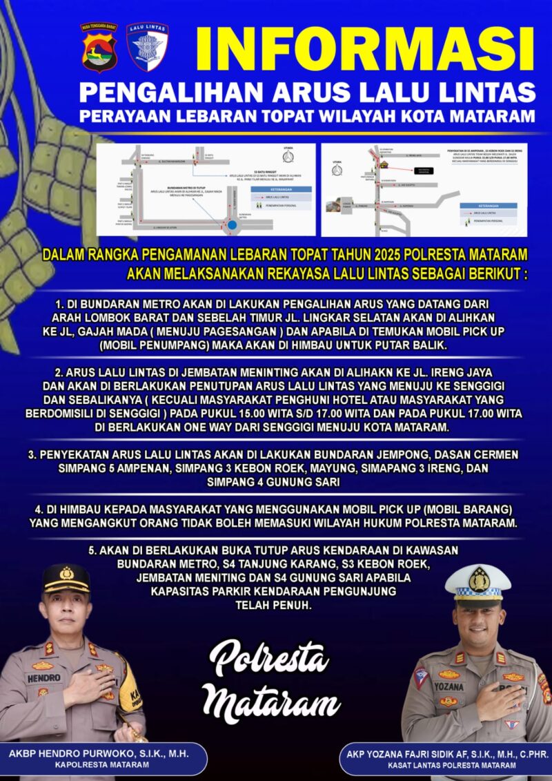 “Mari rayakan Lebaran Topat dengan tertib dan aman. Jangan memaksakan diri memasuki area padat, jika tidak ada keperluan penting, dan patuhi petunjuk rekayasa lalu lintas yang telah disiapkan,” kata Kombes Pol. Kholid.