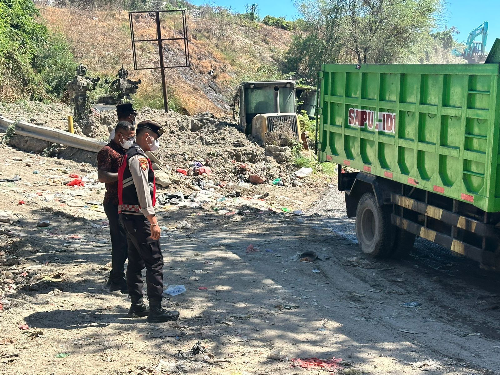 Petugas melakukan pemantauan terhadap arus keluar masuk truk sampah yang datang secara bergilir ke area TPA. Meski kondisi cuaca terik dan berdebu, personel tetap siaga dalam mengawasi aktivitas guna mengantisipasi potensi gangguan kamtibmas.