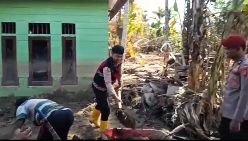 Banjir bandang yang melanda wilayah tersebut meninggalkan endapan lumpur dan serpihan material di sejumlah titik. Personel Polri bersama masyarakat bergotong royong membersihkan bagian dalam rumah, halaman, hingga akses jalan desa yang tertutup material banjir.