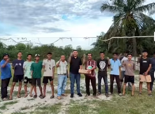 Sebagai bentuk dukungan terhadap olahraga, petang itu Aslam memberikan seperangkat peralatan volley kepada kelompok pemuda Sei Suka Deras.