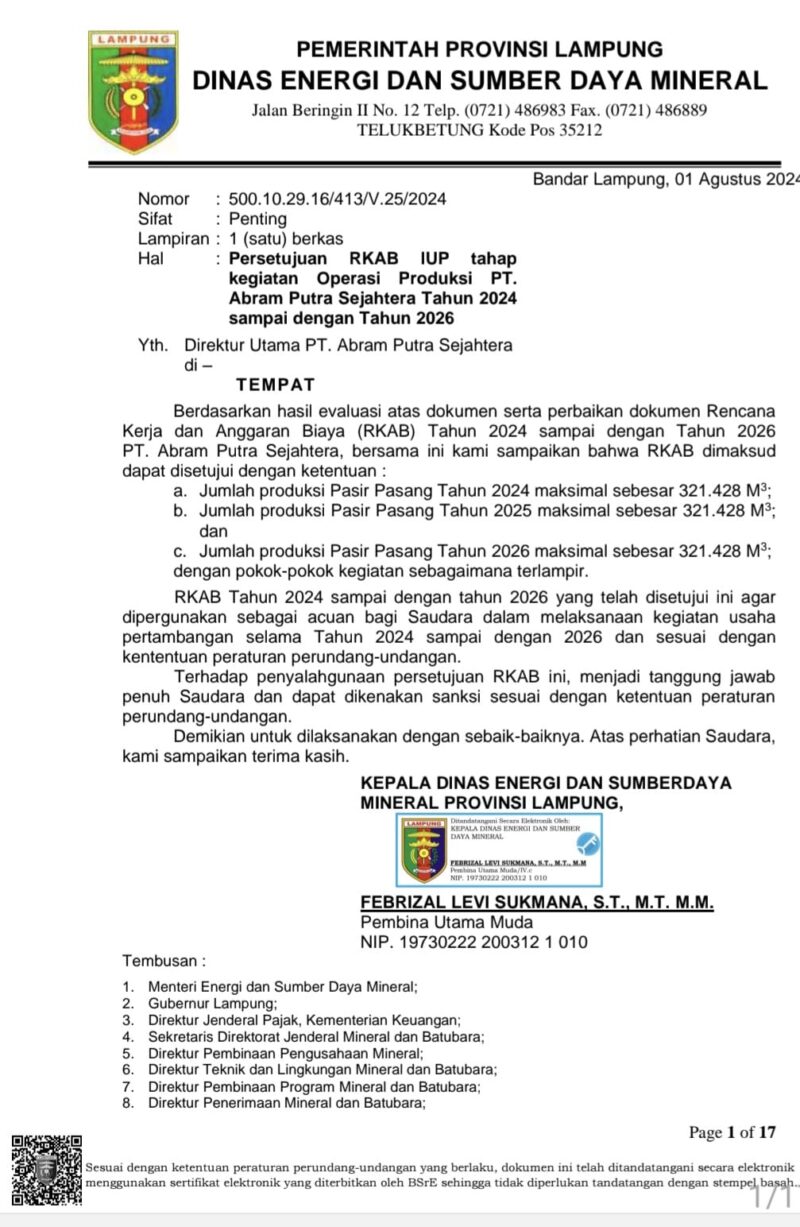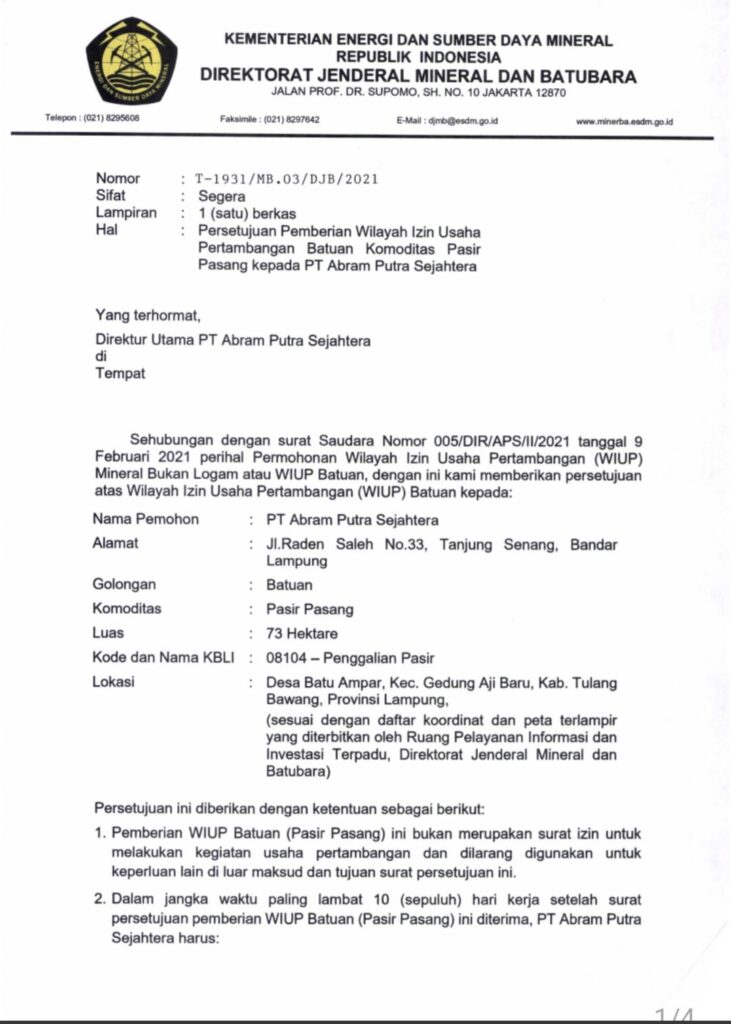 BANDAR LAMPUNG – Sektor pertambangan batuan di Provinsi Lampung terus menunjukkan geliatnya. Terbaru, PT Abram Putra Sejahtera, sebuah perusahaan yang beralamat di Jl. Raden Saleh Nomor 33, Tanjung Seneng, Bandar Lampung, dilaporkan tengah bersiap melakukan kegiatan penggalian pasir di wilayah Kabupaten Tulang Bawang.