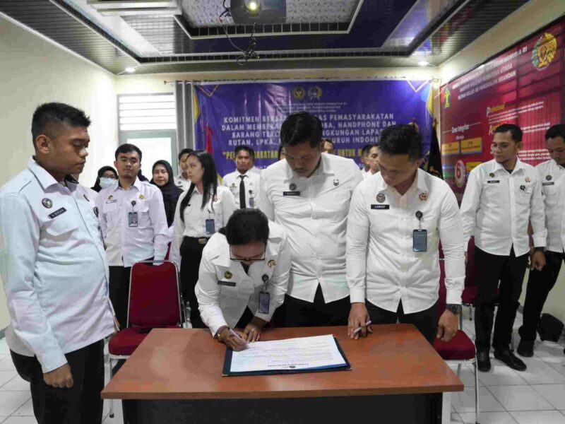 Pangkalan Brandan – Rumah Tahanan Negara (Rutan) Kelas IIB Pangkalan Brandan turut serta dalam penandatanganan komitmen bersama seluruh jajaran Pemasyarakatan se-Indonesia sebagai wujud upaya pemberantasan peredaran gelap narkoba, handphone, dan barang-barang terlarang lainnya di lingkungan Lapas, Rutan, LPKA, dan Bapas. Kegiatan ini menegaskan keseriusan petugas pemasyarakatan dalam menjaga integritas dan profesionalitas.