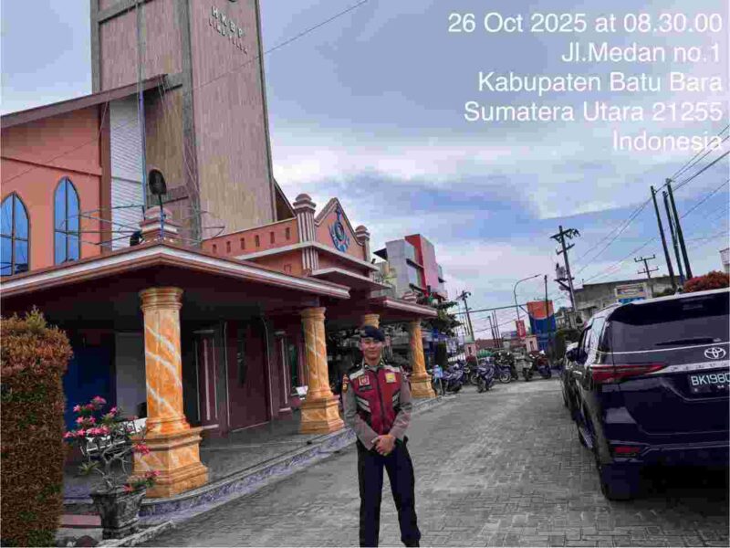 Batu Bara – Satuan Sabhara Polres Batu Bara meningkatkan patroli dan pengamanan di gereja-gereja yang berada di wilayah hukumnya pada Minggu (26/10/2025). Kegiatan ini dilaksanakan mulai pukul 08.30 WIB hingga selesai.