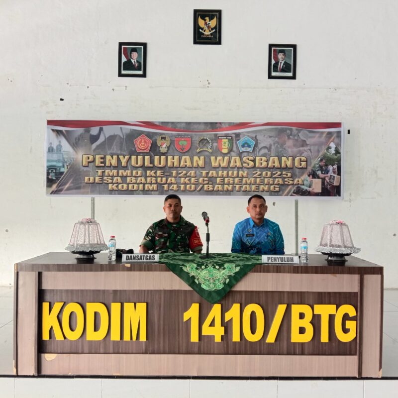 Kegiatan penyuluhan wawasan kebangsaan menghadirkan narasumber dari Kantor Kesatuan Bangsa dan Politik (Kesbangpol) Kepala Badan Kesbangpol Kabupaten Bantaeng, Faisal, S.Stp., M.Si., Kapten Inf Andi Usman Danramil 1410-01/Bissappu selaku Plt Dansatgas TMMD ke 124 Kodim 1410/Bantaeng Letkol Inf Eka Agus Indarta, S.Psi, M.Psi., dan para peserta penyuluhan yang berasal dari Tokoh masyarakat, Tokoh Agama, Perangkat desa dan warga masyarakat terutama para pemuda Desa Barua, Kecamatan Eremerasa, Kabupaten Bantaeng.