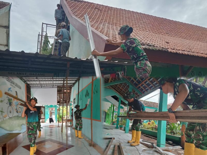 Suasana pagi yang masih diselimuti gerimis tipis, kembali bernapas bersama irama palu dan derit bambu. Di halaman SMP Negeri 2 Gondangwetan prajurit Satgas TNI Manunggal Membangun Desa (TMMD) Ke-127 Kodim 0819/Pasuruan bergerak selaras bagai satu tubuh. Seragam loreng hijau tua berpadu dengan sepatu boot kuning cerah menjadi warna dominan yang menghiasi renovasi sekolah di Desa Wonosari, Kecamatan Gondangwetan, Kabupaten Pasuruan, Sabtu (28/2/2026).