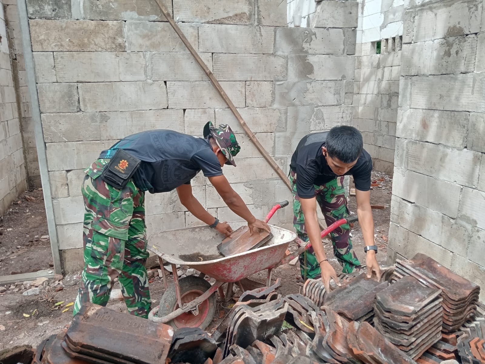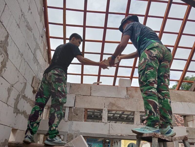 Matahari pagi yang hangat di Dusun Ngepreng, terdengar irama kerja yang ritmis suara genteng yang saling bertemu, campur aduk dengan tawa ringan dan arahan sesekali dari para prajurit. Itulah pemandangan di lokasi di Desa Wonosari, Kecamatan Gondangwetan, Kabupaten Pasuruan, Minggu (1/3/2026).