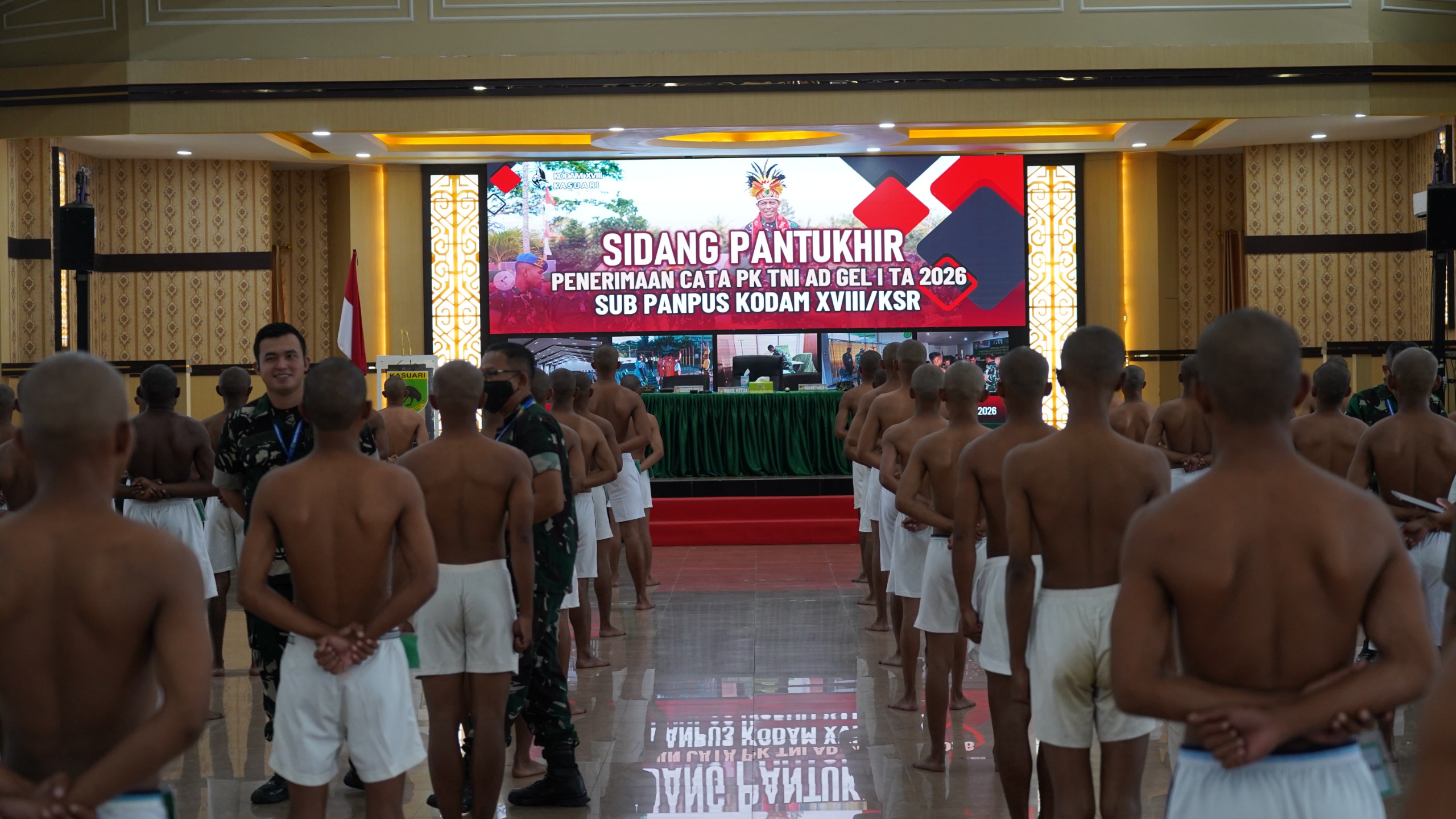 [ MANOKWARI ] teropongbarat.com Kodam XVIII/Kasuari menggelar Sidang Pantukhir Calon Tamtama Prajurit Karier (Cata PK) TNI AD Gelombang I Tahun Anggaran 2026, di Aula Makodam XVIII/Kasuari, Jumat (13/03/2026). Kegiatan tersebut dipimpin oleh Kolonel Inf Hendra S., selaku Wakil Ketua Sub Panitia Pusat (Sub Panpus) Kodam XVIII/Kasuari, yang diikuti oleh 358 calon prajurit. Sidang Pantukhir merupakan tahapan akhir dalam rangkaian seleksi penerimaan prajurit TNI AD yang menjadi penentu bagi para calon untuk melangkah menuju gerbang pengabdian sebagai prajurit. Para peserta sebelumnya telah melalui berbagai tahapan seleksi secara ketat, mulai dari pemeriksaan administrasi, kesehatan, kesamaptaan jasmani, mental ideologi hingga psikologi. Dalam kesempatan tersebut, Wakil Ketua Sub Panpus Kodam XVIII/Kasuari membacakan sambutan Aspers Kasad bahwa setiap keputusan yang diambil dalam sidang harus benar-benar berdasarkan hasil seleksi yang menyeluruh dan telah diakumulasi secara objektif guna memilih calon terbaik.