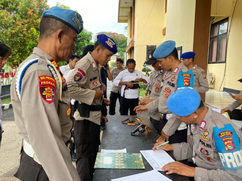 Kota Bima, NTB (9 Desember 2024) Sie Propam Polres Bima Kota melaksanakan kegiatan pemeriksaan administrasi dan pengawasan senjata api (senpi) organik Polri pada Senin, 9 Desember 2024, pukul 08.00 WITA, bertempat di Lobi Polres Bima Kota.