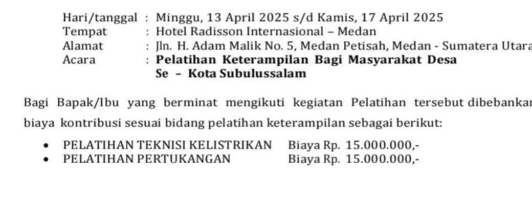 Kota Subulussalam, Aceh – Skandal pelatihan Rp 2,4 miliar di Medan kembali menguak fakta mengejutkan. Usulan pelatihan pertukangan dan kelistrikan senilai miliaran rupiah yang diduga diselipkan oknum pejabat tertentu, ternyata bukan berasal dari musyawarah warga. Hal ini semakin memperkuat kecurigaan adanya kongkalikong dalam proyek pelatihan mewah yang menelan biaya Rp 30 juta per peserta.