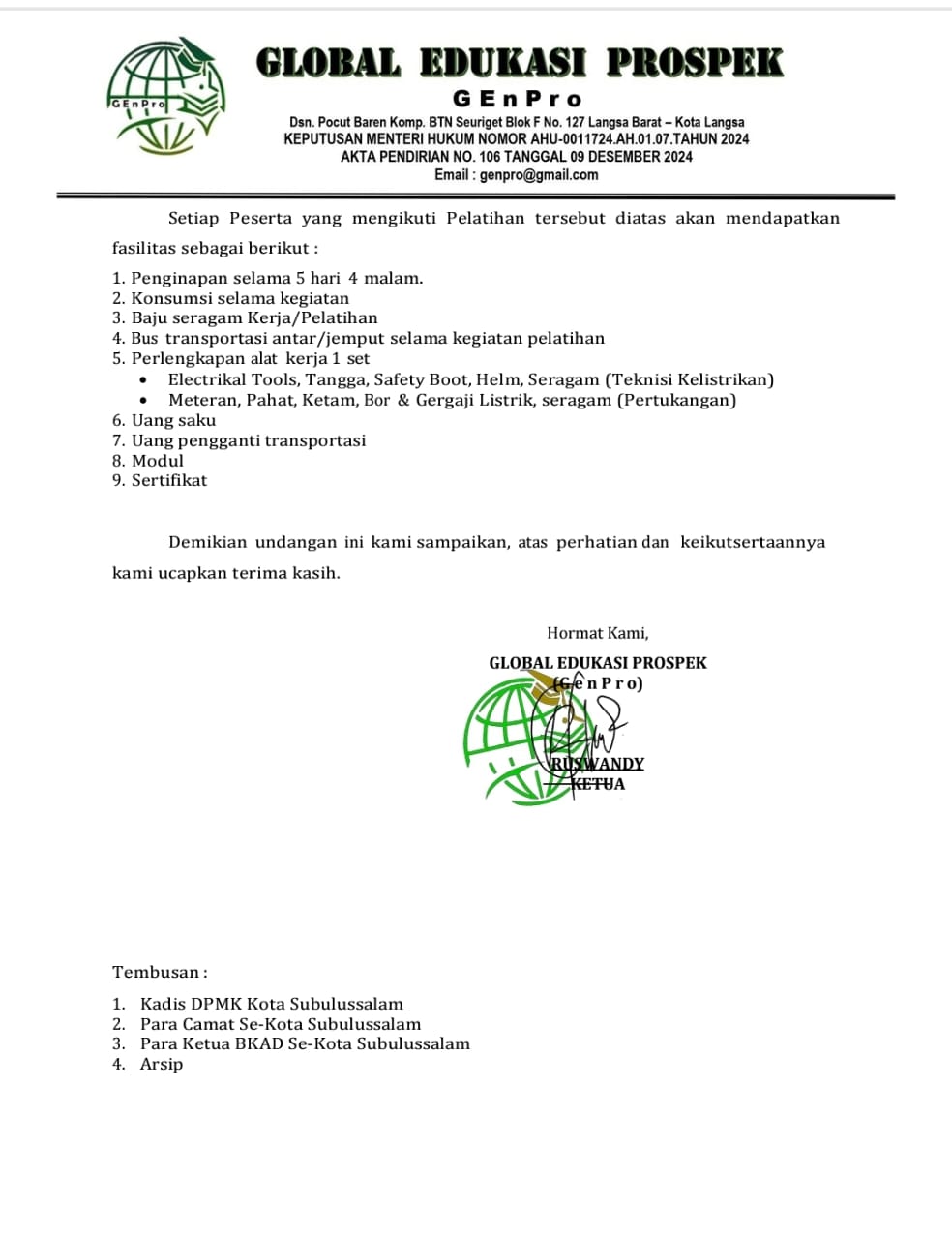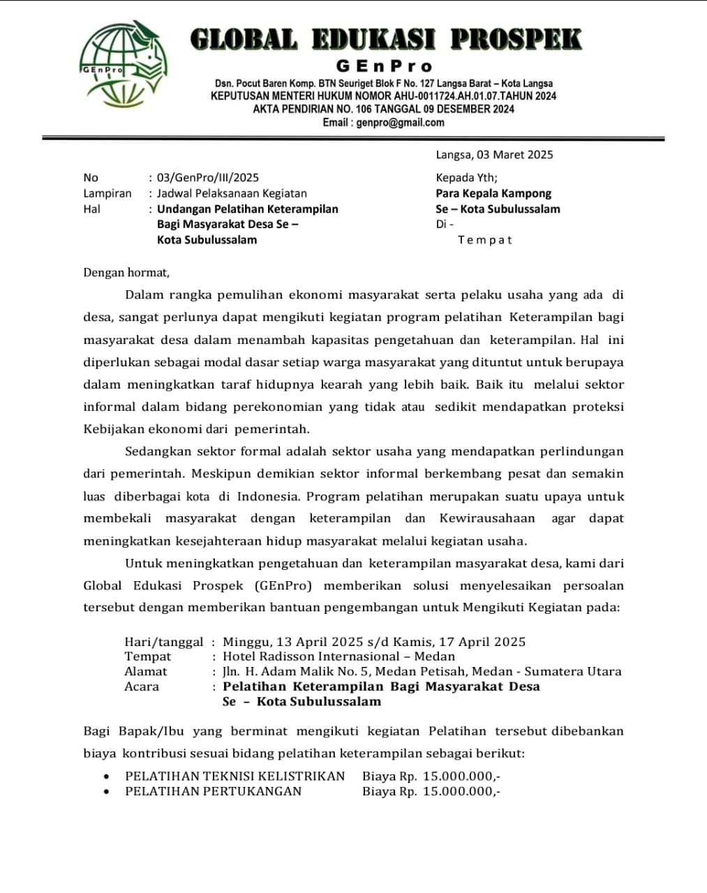 Global Edukasi Prospek (GenPro), melalui perwakilannya Wandi, tetap bersikukuh pelatihan akan berjalan sesuai jadwal (Undangan No. 003/GenPro/III/2025). Namun, keengganan Wandi memberikan keterangan lebih lanjut semakin menimbulkan kecurigaan.