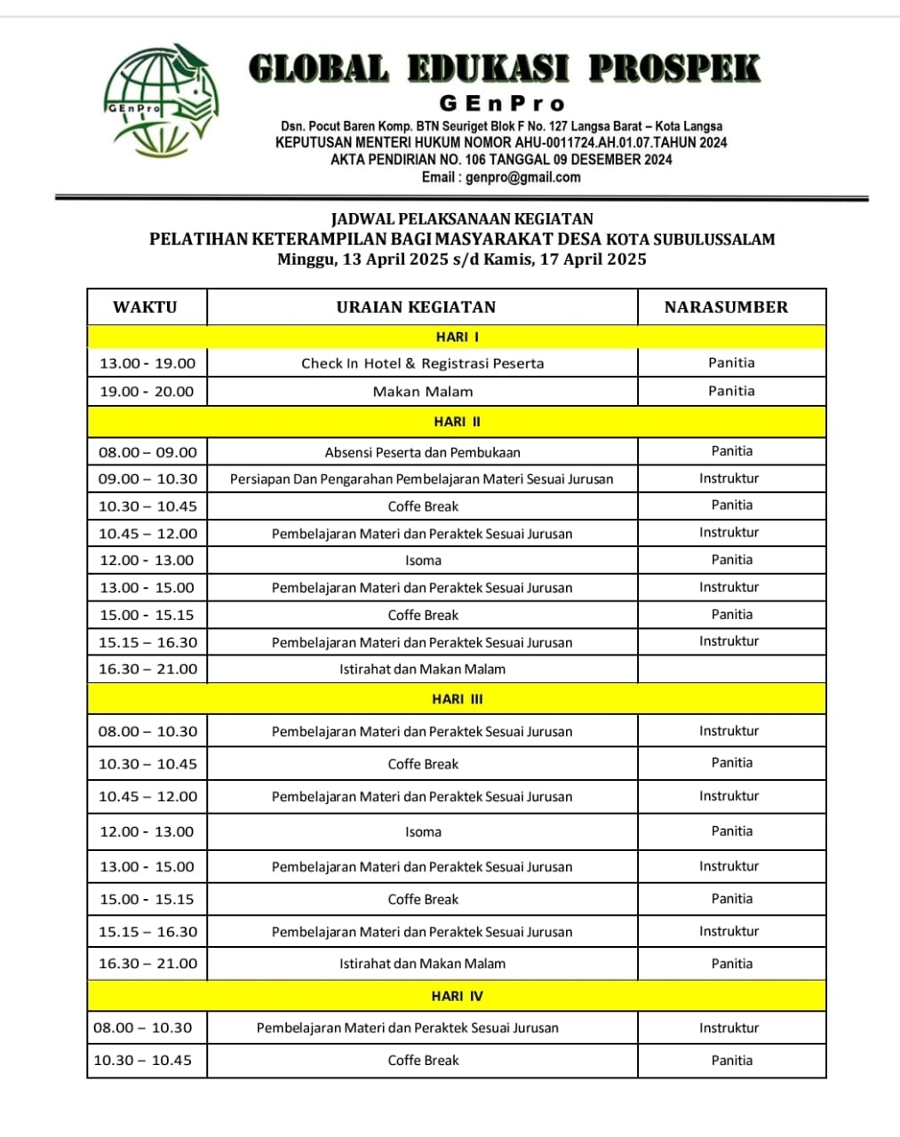 LSM Aliansi Peduli Indonesia (API) Kota Subulussalam semakin gencar menyoroti kejanggalan ini. Plt. Kepala Dinas Pemberdayaan Masyarakat dan Kampong (DPMK), Hamdansyah, kembali menegaskan ketidaktahuannya akan detail pelatihan yang diselenggarakan oleh Global Edukasi Prospek (GenPro). Ia menekankan bahwa DPMK hanya bertugas memberikan edukasi dan pengawasan, bukan mengelola dana pelatihan yang sudah disetujui melalui… musyawarah desa yang dipertanyakan keabsahannya.