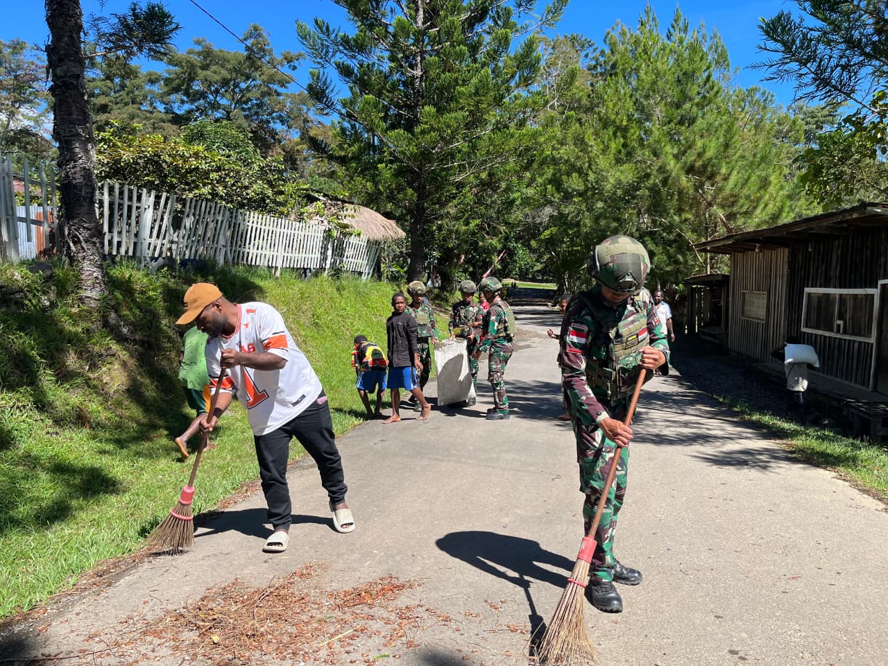 Kegiatan ini merupakan wujud nyata sinergi antara TNI dan masyarakat dalam menjaga kebersihan lingkungan sekaligus mempererat hubungan kekeluargaan. Dengan penuh semangat gotong royong, personel Satgas bersama warga bahu-membahu membersihkan area pemukiman, fasilitas umum, serta lingkungan sekitar kampung.l