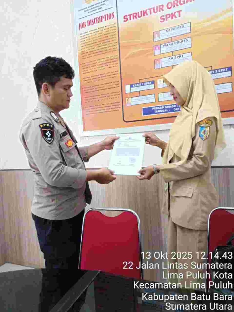 Afrita Asmarani melaporkan dugaan penipuan yang dialaminya ke SPKT Polres Batu Bara. Setelah menerima laporan, petugas SPKT memberikan Surat Tanda Bukti Laporan Polisi (STTLP) kepada pelapor sebagai bukti resmi bahwa laporan telah diterima dan akan diproses lebih lanjut sesuai dengan prosedur hukum yang berlaku.