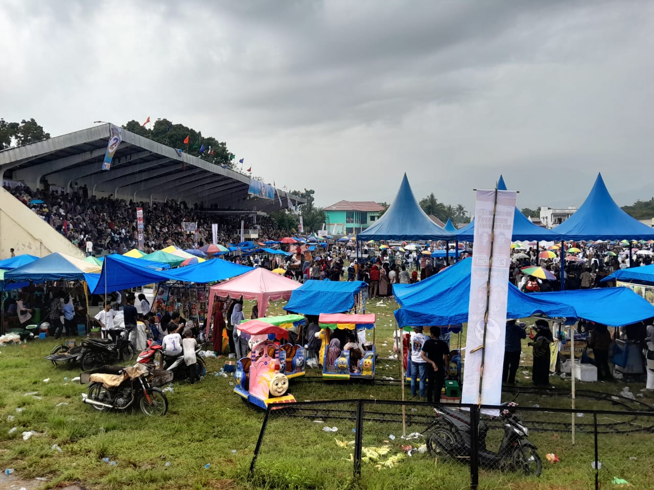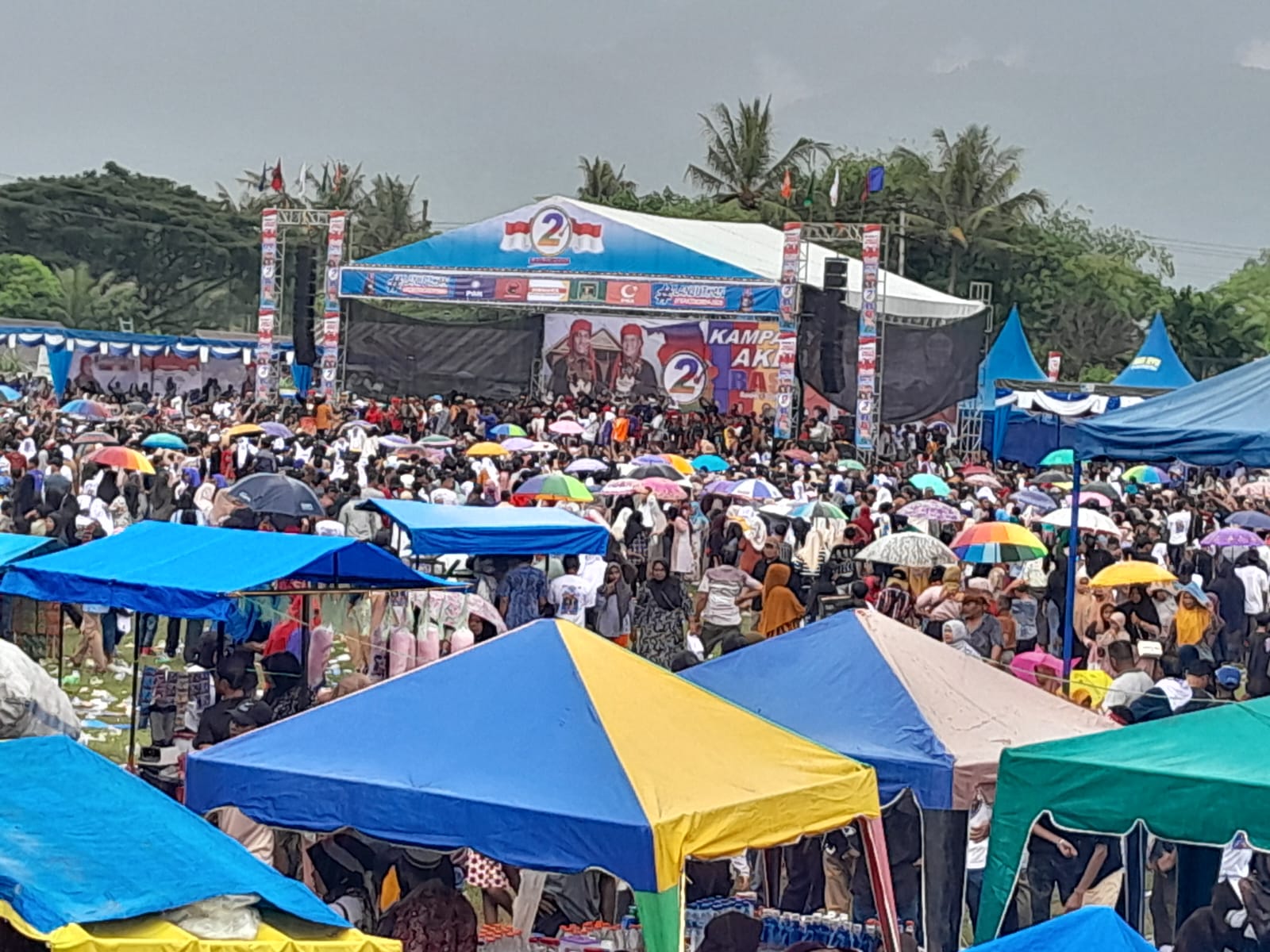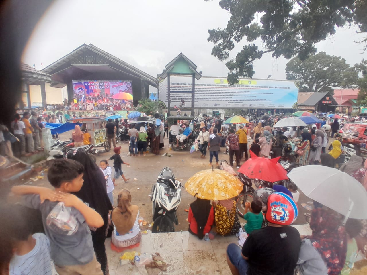 Sementara sebagian warga terpaksa menyimak orasi paslon RASA di luar stadion melalui layar tancap lantaran di dalam ada rintik rintik hujan takut sakit demam batuk plu kata penonton di luar tak sebut namanya itu.