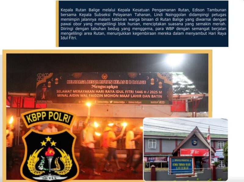 Balige – Minggu, 30 Maret 2025, Malam takbiran di Rumah Tahanan Negara (Rutan) Kelas IIB Balige berlangsung penuh khidmat dan kebersamaan. Warga Binaan Pemasyarakatan (WBP) yang beragama Islam dengan penuh semangat menyambut Hari Raya Idul Fitri 1446 Hijriyah, meski harus merayakannya di balik jeruji besi. Suasana religius dan kegembiraan terpancar dalam setiap lantunan takbir yang menggema di seluruh area Rutan Balige, Minggu (30/03).