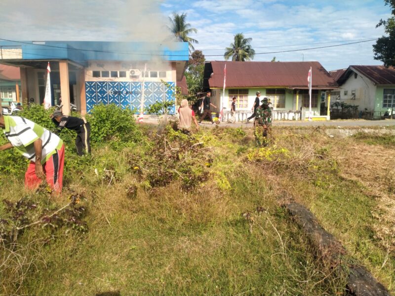 Saat melaksanakan kerja bakti, terlihat para siswa dengan penuh semangat bersama anggota Babinsa dari Koramil Marbo saling bahu membahu membersihkan lapangan dan tempat umum seperti pinggir kiri kanan jalan.