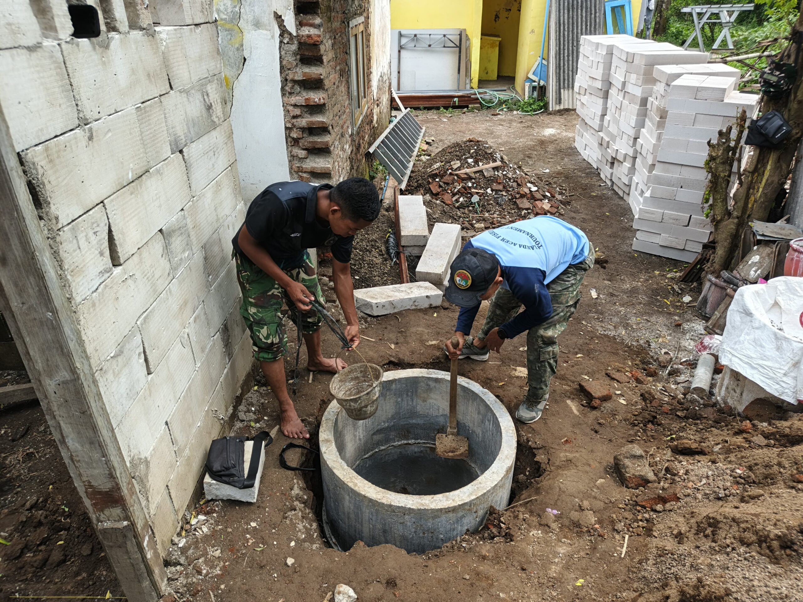 Prajurit Satgas TNI Manunggal Membangun Desa (TMMD) Reguler Ke-127 Kodim 0819/Pasuruan bersama warga Desa Wonosari, Kecamatan Gondangwetan, Kabupaten Pasuruan, terus menuntaskan pembangunan fasilitas Mandi, Cuci, Kakus (MCK) komunal. Kegiatan yang berlangsung Selasa (10/3/2026) ini menunjukkan semangat gotong royong yang tetap kuat meski program TMMD telah memasuki tahap akhir.Di lokasi pembangunan, dua prajurit TNI terlihat bekerja di sekitar sumur beton. Seorang prajurit menuangkan air dari selang ke ember, sementara rekannya meratakan adukan semen di dasar lubang menggunakan cangkul. Tumpukan batu bata yang siap dipasang menjadi tanda bahwa pembangunan fasilitas sanitasi tersebut terus berjalan.