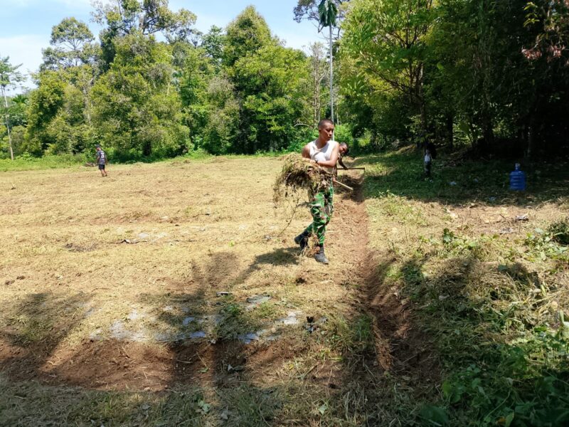 Dengan penuh semangat kebersamaan, personel TNI dan warga bahu-membahu membersihkan lahan dari semak belukar dan tanaman liar. Lahan tersebut nantinya akan dimanfaatkan sebagai area produktif guna mendukung kebutuhan pangan masyarakat setempat.