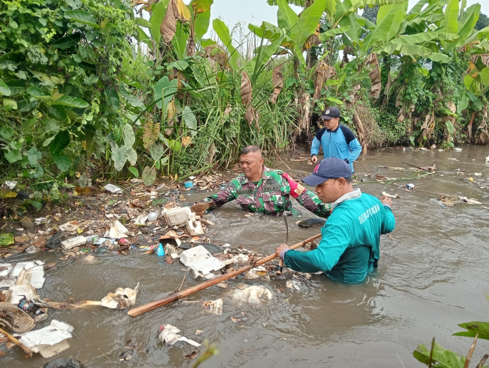 Di tengah kegiatan, seorang prajurit berpangkat Serda terlihat membungkuk di air mengangkat sampah dan lumpur, sementara rekannya membantu dengan galah panjang membersihkan dasar sungai. Pepohonan di sekitar menjadi saksi semangat gotong royong antara TNI dan masyarakat.