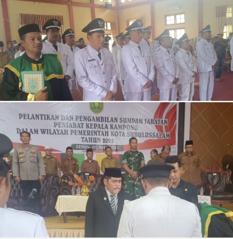Subulussalam, Aceh l Dalam sebuah upacara pelantikan yang berlangsung khidmat di Aula Pondopo Walikota Subulussalam, sebanyak 25 Penjabat Kepala Desa di Kota Subulussalam resmi dilantik oleh Wakil Walikota Subulussalam, MHD. Nasir, SE. Acara penting ini dihadiri oleh sejumlah pejabat penting, termasuk Wakil Kepala Kepolisian Resor Subulussalam, perwakilan Dandim 0118 Subulussalam, Kepala Dinas Pemberdayaan Masyarakat dan Kampung (DPMK), Mukim Kombih, Mukim Penanggalan, Camat Penanggalan, dan Camat Simpang Kiri.05/05/2025