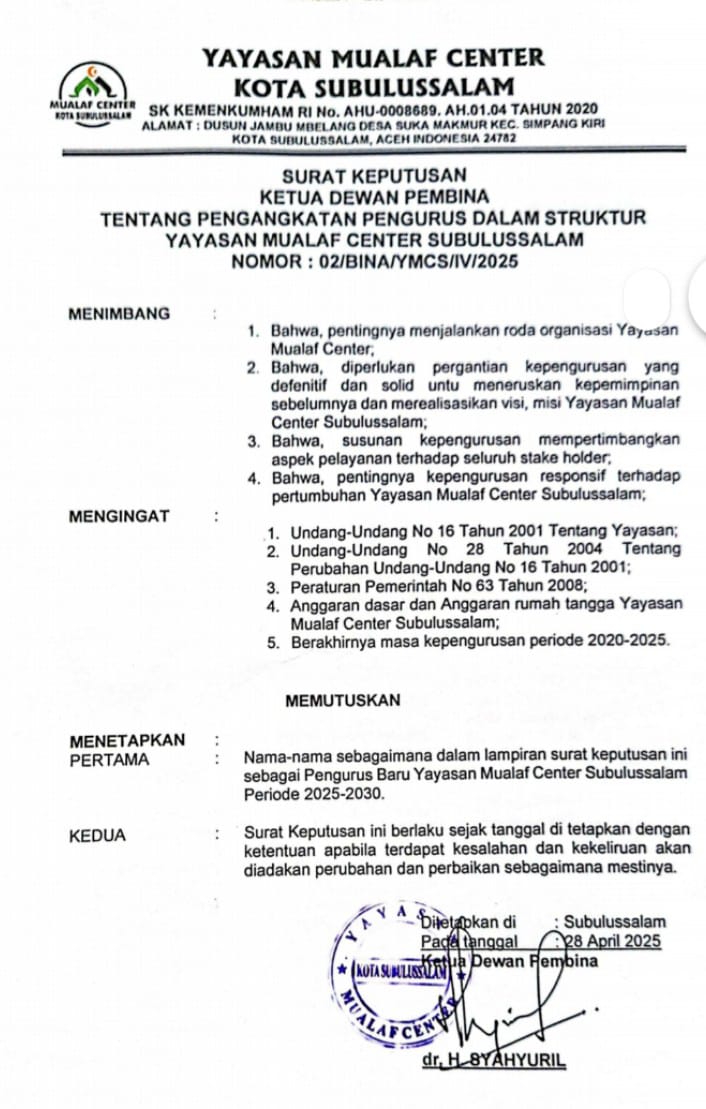 Eksistensi Yayasan Muallaf Center Kota Subulussalam semakin diperkuat secara kelembagaan dengan terbitnya Surat Keputusan Ketua Dewan Pembina. SK ini secara resmi ditandatangani oleh dr. H. Syahyuril, yang menjabat sebagai Ketua Dewan Pembina yayasan tersebut.